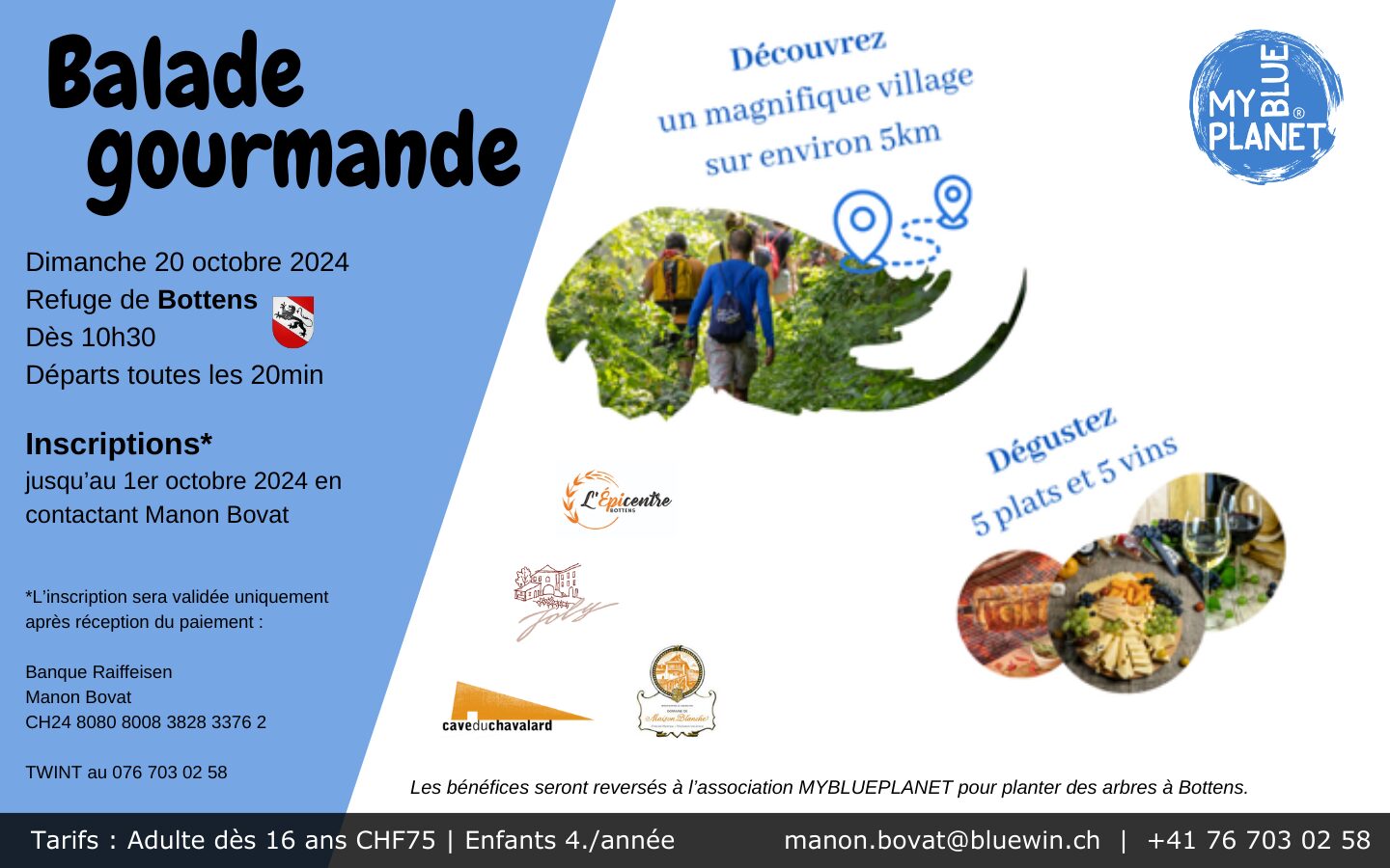 Manon Bovat, passionnée de gastronomie et de sa région, est ravie de vous convier à participer à une Balade gustative, le dimanche 20 octobre, sur la commune de Bottens. Cet événement unique, alliant découvertes culinaires et promenades bucoliques sur 5km, invite les participants à explorer les saveurs authentiques du Gros-de-Vaud tout en parcourant les magnifiques paysages de la commune. La balade sera ponctuée de stands d’animation et de dégustation de 5 plats et 5 vins locaux (eau et sirop à volonté à chaque stand).