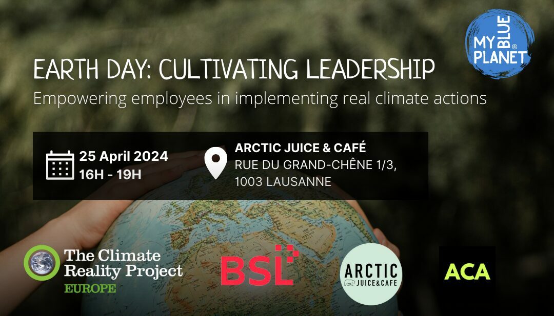 À l’occasion de cette journée, MYBLUEPLANET et la Business School Lausanne (BSL) organisent un événement « Earth Day », de 16h à 19h, qui aura lieu le 25 avril 2024 à Rue du Grand-Chêne 1/3,1003 Lausanne, Arctic Juice & Café Lausanne. Cet événement est organisé en collaboration avec The Climate Reality Group Europe.
