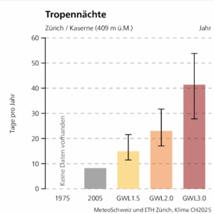 Beispiel: Anzahl Tropennächte in der Stadt Zürich bei globaler Erwärmung (GWL) um 1,5 °C, 2,0°C bzw. 3,0 °C
